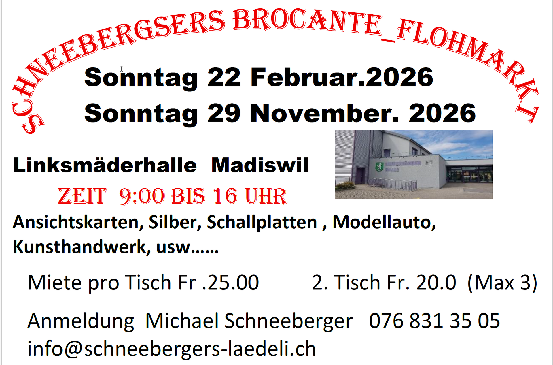 Platzbuchung telefonisch jeweils am Dienstag vor dem Flohmarkt 10.00 - 14.00 Uhr
